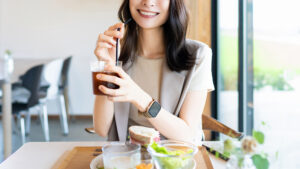 カフェでランチを食べる笑顔の女性