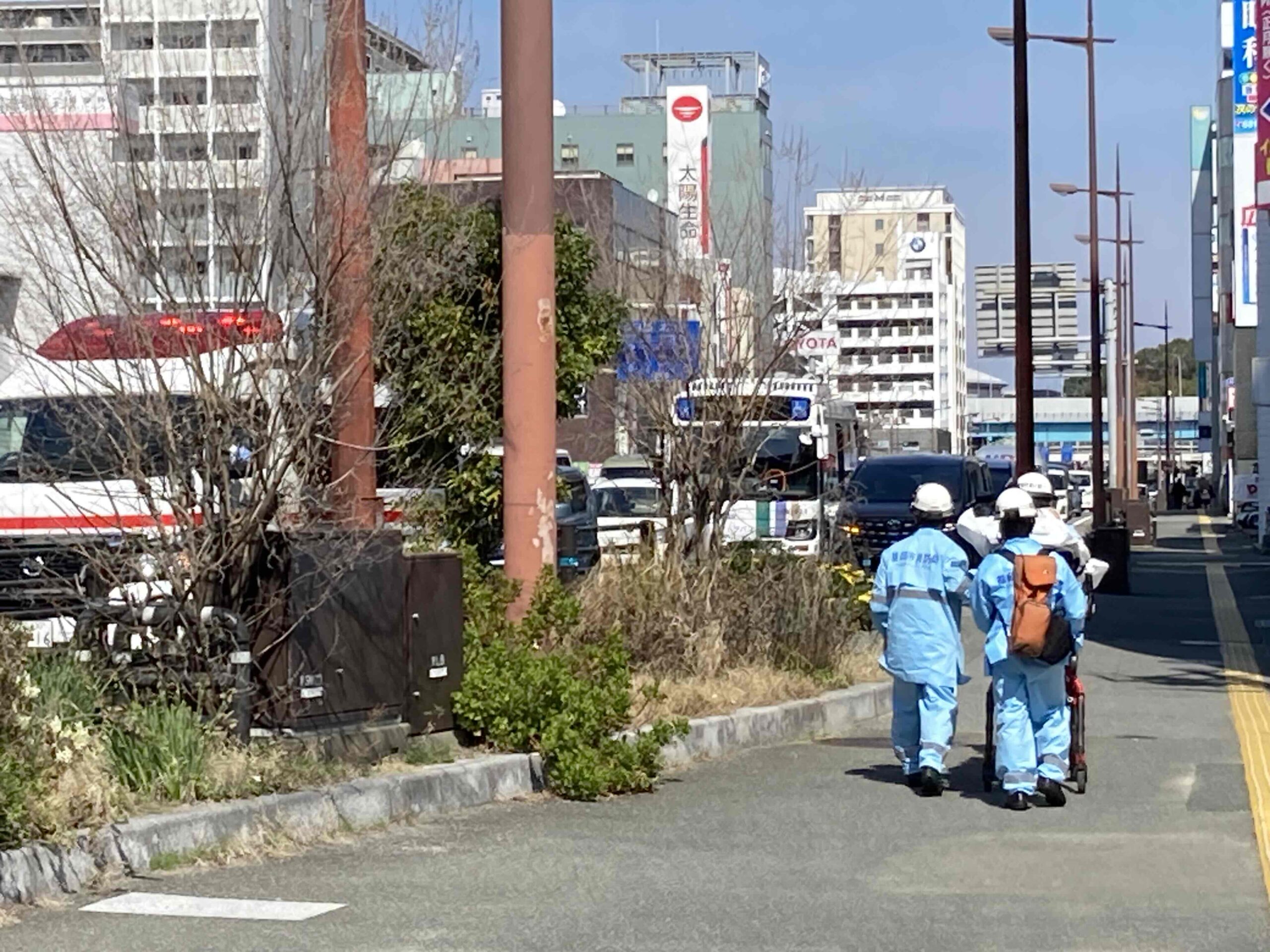 3/11(水)午前11時過ぎ、利用者4名(A~Dさん)と私(支援員)が事業所恒例になっているハローワークへのウォーキングしていました。ちょうど香椎参道交差点近くの駐車場を通り過ぎ、歩道橋の階段上ろうとしたときに利用者Aさんが、転倒してうつ伏せになり、動けなくなった男性(80代)を発見しました。Aさんは日頃からとても反応がよい人です。もしも彼がそれに気が付かなかったら発見が遅れ大事に至っていたかもしれません。すぐに全員でその男性のもとに駆け寄りました。その方は頭を地面にひどく打ちつけたようで意識はあるものの頭と手から出血し朦朧としていました。これを見て瞬時にBさんが電話で救急車を要請。Cさんは怪我人に寄り添い仰向けにし、この方の後頭部を左手で支えながら不安を取り除くためにやさしく話しかけました。AさんとBさんと私はサイレンを鳴らして駆け付けた救急隊員を現場に誘導しました。Dさんは、散らかった男性の荷物をきちんとまとめて駆けつけた隊員に手渡し。Cさんは、若い時にホテルのフロント業務で働いた経験があり今回の行動に役立ったようです。誰かが号令をかけるでもなく瞬時に自分がやれることを探しそれぞれの役割を果たせたことがとても素晴らしかったです。時間にすれば15分くらいの出来事でしたが日頃の事業所内の利用者のみなさんのチームワークの良さがこの一瞬に集結したような気がしました。その意味でとても貴重な経験ができたと思いました。